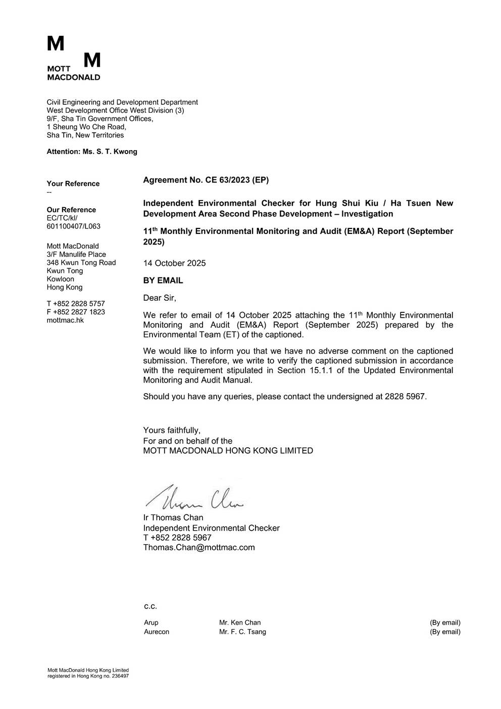 11.1.11 As the construction phase EM&A programme of Contract 4 started on 8 September 2025, the findings of EM&A works at Contract 4 under the Project are reported starting from this reporting period.