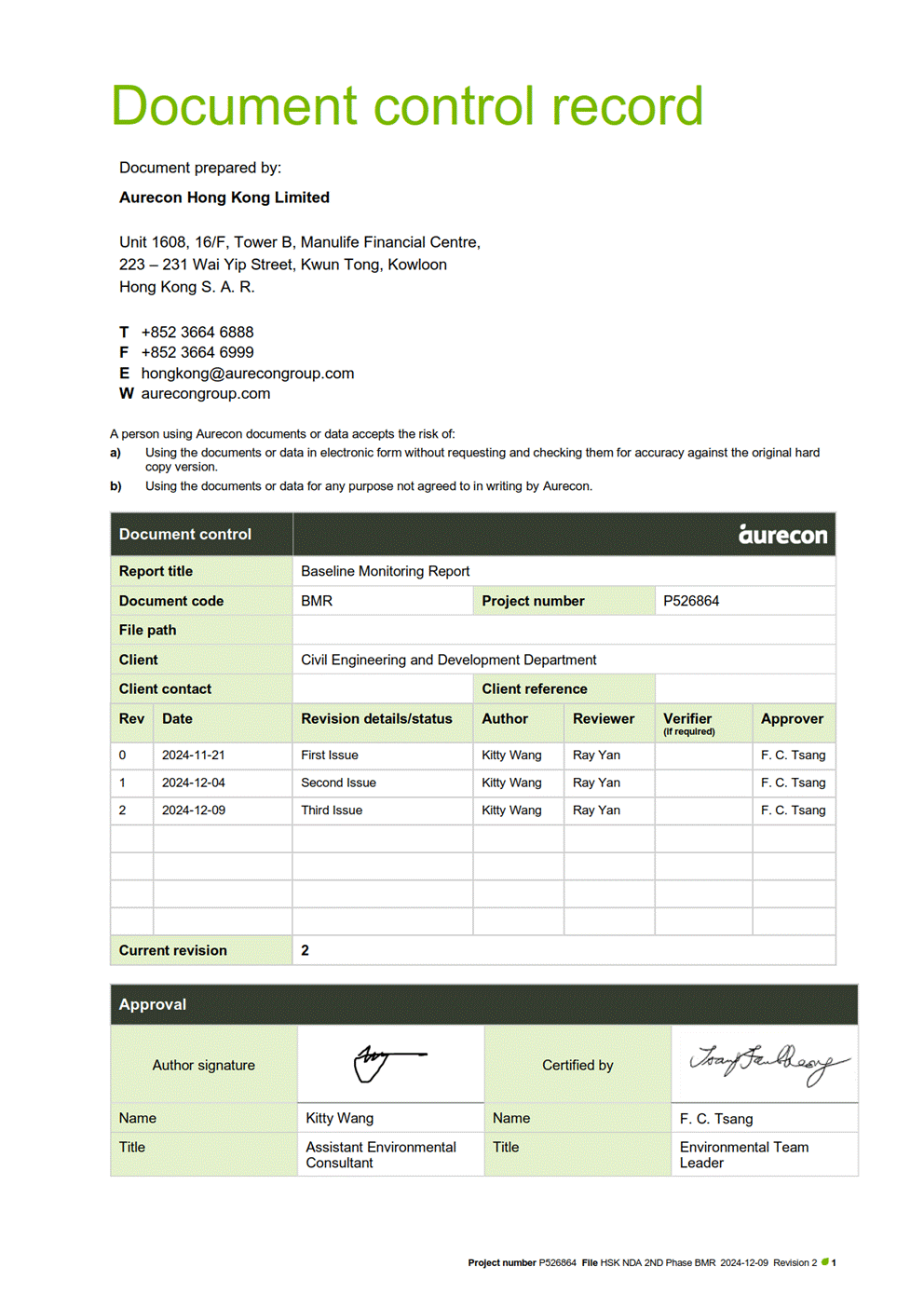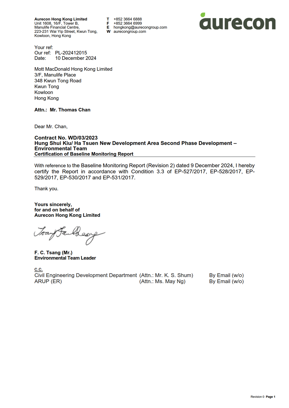 In accordance with the requirements specified in the EPs and the EM&A Manual for the Project, a Baseline Monitoring Report (the Report) should be certified by the ET leader, verified by the Independent Environmental Checker (IEC) and submitted to the Director of Environmental Protection (DEP) before commencement of construction of the Project.
