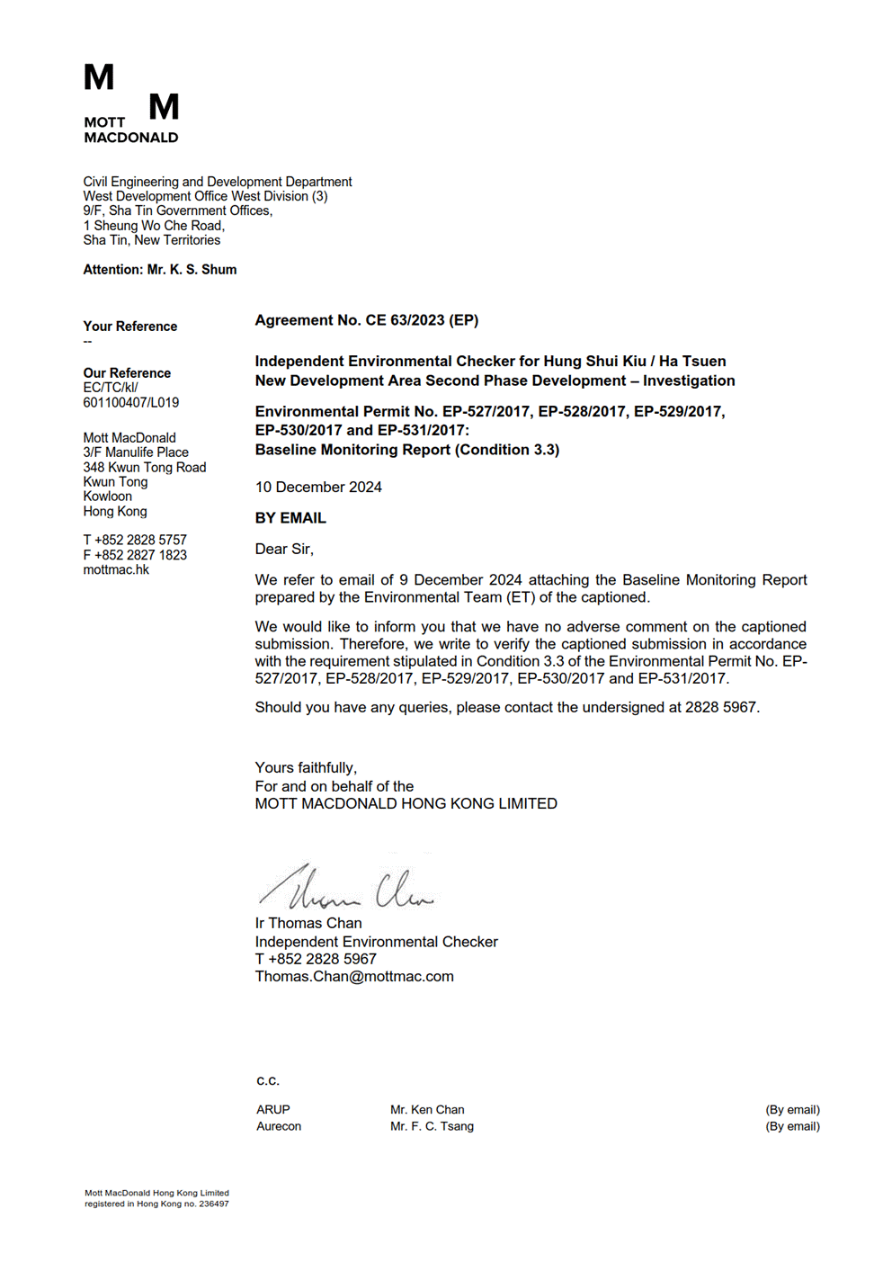 The EIA Report for Hung Shui Kiu New Development Area (HSK NDA) (Register No. AEIAR-203/2016) was approved with conditions under the EIA Ordinance on 15 December 2016. A total of six EPs associated with the designated projects within HSK/HT NDA (i.e. EP-531/2017, EP-530/2017, EP-529/2017, EP-528/2017, EP-527/2017 & EP-526/2017) were subsequently issued in February 2017. In addition, the EP for construction of four new sewage pumping stations (i.e. EP-526/2017) was surrendered on 13 November 2023.
